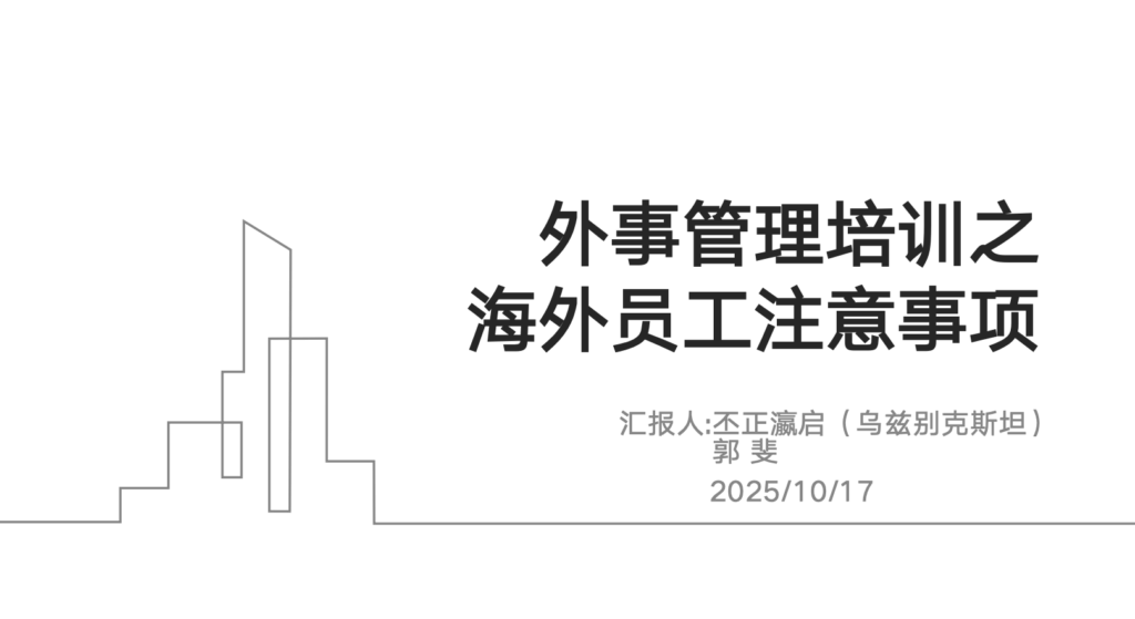 17 октября 2025 года адвокат Го Фэй, исполнительный директор юридической фирмы Пи Чжэн Ин Ци (Узбекистан), был приглашен провести обучение по вопросам внешних связей для сотрудников за рубежом компании China State Construction Xiaoxiang (Узбекистан) Co., Ltd. и проектного отдела в Киргизии. Адвокат Го, опираясь на местное законодательство Узбекистана и реальные кейсы, рассмотрел ключевые ситуации, такие как миграция и проживание, поведение в общественных местах, вождение и дорожное движение, выявив часто встречающиеся риски нарушений и основные требования соблюдения закона, создавая для сотрудников китайских компаний за рубежом практическое руководство по «избежанию проблем».