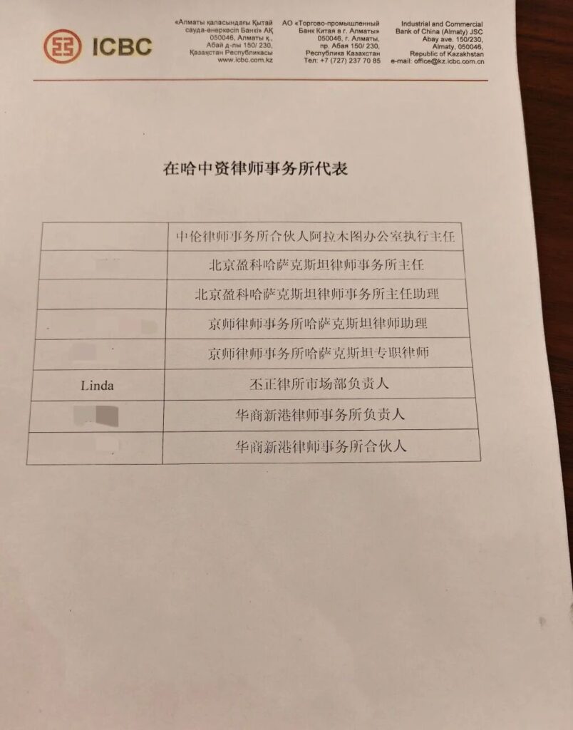 3 декабря 2025 года в Алматинском филиале Китайского промышленно-торгового банка успешно состоялось заседание Круглого стола китайских юридических фирм в Казахстане. Заседание вел министр юридического департамента Китайской торговой палаты Юй И, а также в нём приняли участие генеральный директор Алматинского филиала ICBC Лю Хунхай, представители представительства Китайской торговой палаты в Казахстане и представители нескольких китайских юридических фирм, работающих в Казахстане, совместно обсуждавшие пути качественного развития китайско-казахстанских трансграничных юридических услуг. Руководитель отдела маркетинга адвокатской фирмы Hunan Pizheng Линда была приглашена на мероприятие и представляла фирму для тесного взаимодействия с отраслевыми ресурсами и распространения концепции профессиональных трансграничных юридических услуг.